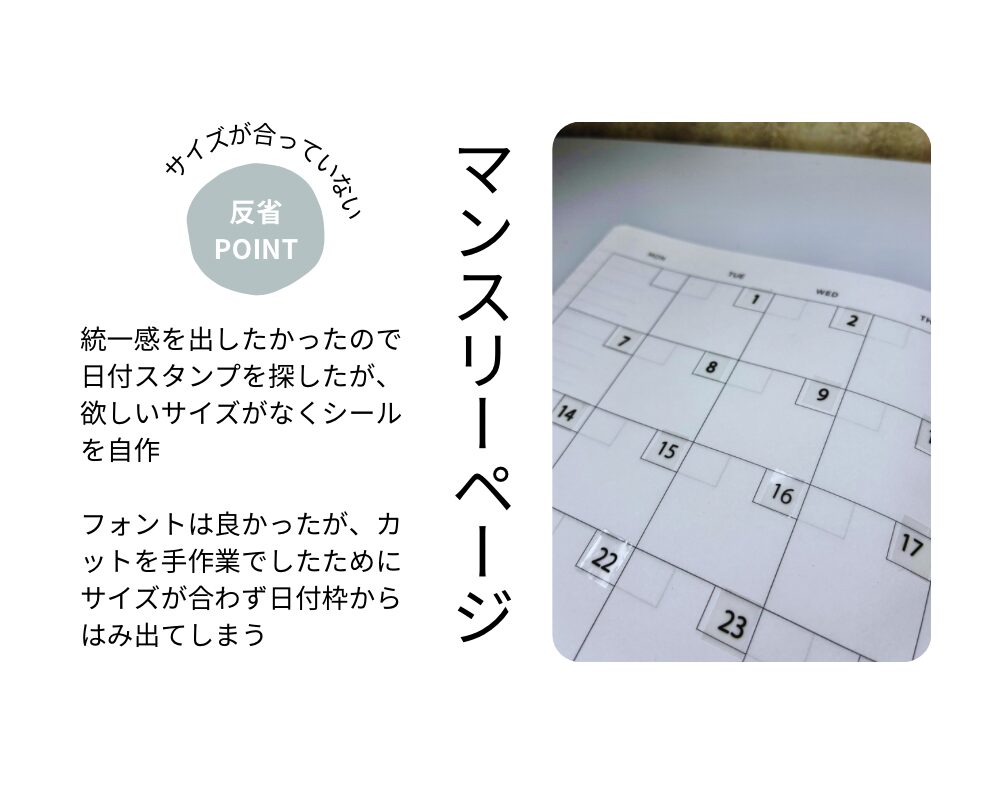 ASANE Lさんの日付シール、必要数は2個なのに1個しか買ってなくて結局マンスリーページは自作することになりました
