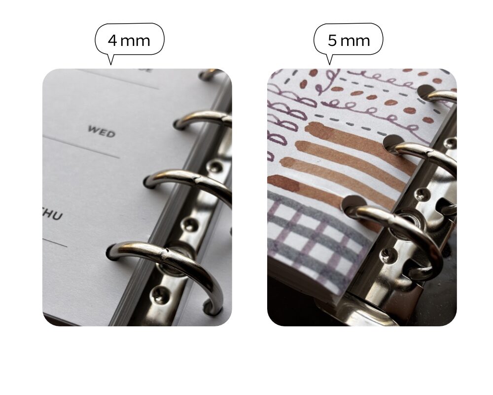 ルーズリーフ等で使うパンチの穴は直径約5mmのものが多いため、それをM6のリフィルで使うとバインダーのサイズに対してゆるゆるなので、イメージと違うしなんだか締まりがない印象を受けました。